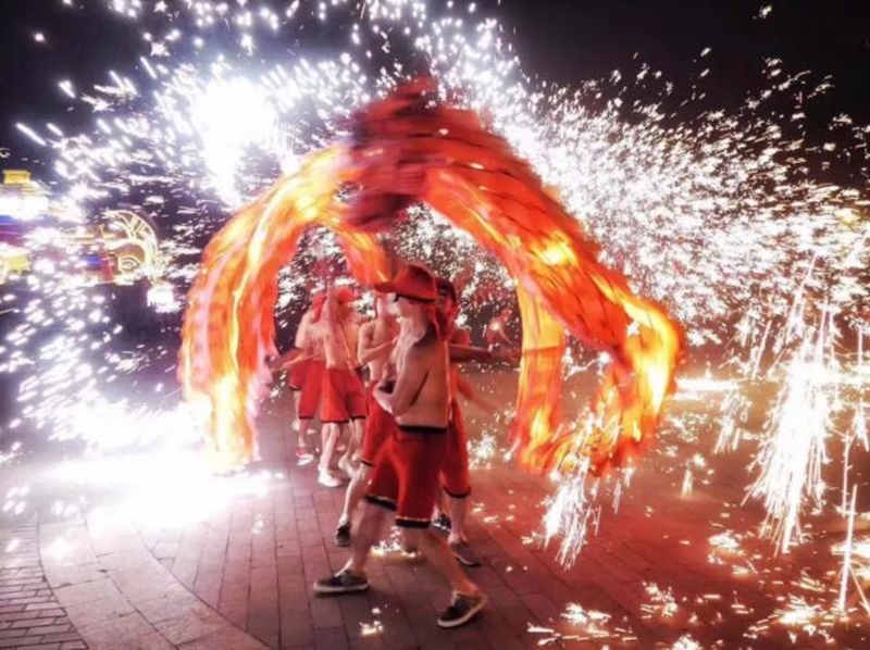 1500多度的鐵水灑向天空,瞬間綻放成奪目的鐵水流星雨,赤膊的漢子在飛舞的火花間翻轉騰挪,手舞巨龍奔跑騰躍,上下回旋,內外穿花,構造了一幅“人在龍中舞,龍在火中飛”的奇美畫面。